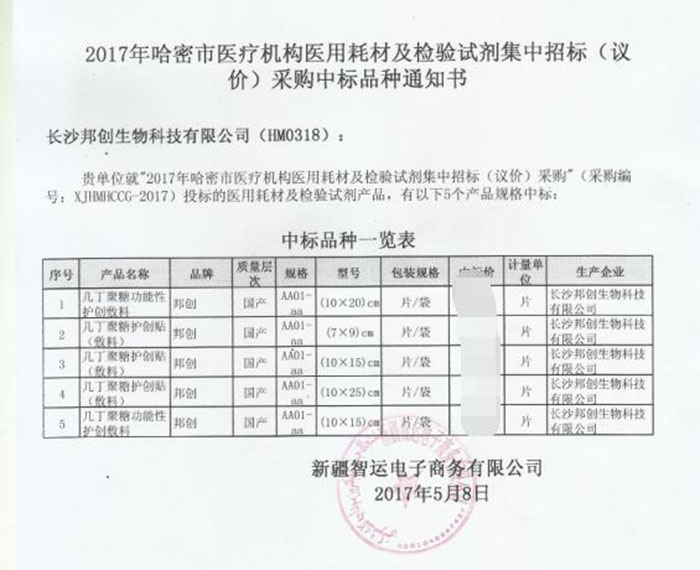 恭賀我公司產(chǎn)品在2017年新疆哈密醫(yī)用耗材招標采購項目中標